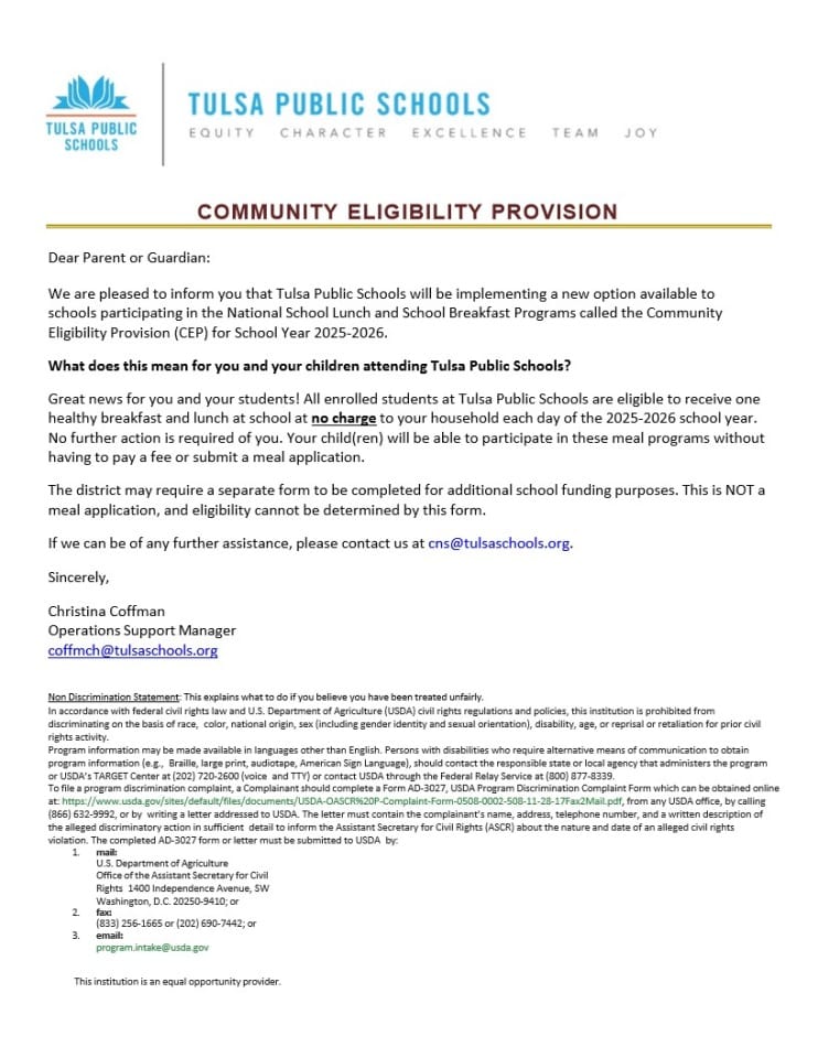 Community Eligibility Provision letter to families